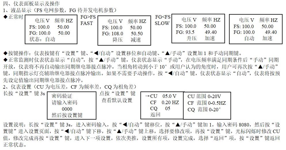 ◆ 同期完成0°指示燈常亮,儀表可長(zhǎng)期處于電壓頻率監(jiān)測(cè)狀態(tài)。