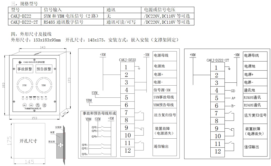 輸入信號:SYM事故信號,YBM預(yù)告信號,有源電壓信號輸入;RS485通訊輸入。