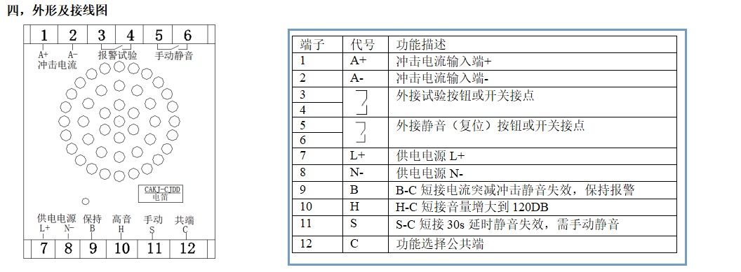 注:電笛基本功能:某個(gè)光字牌報(bào)警時(shí)通過(guò)報(bào)警母線(xiàn)將電流輸入電笛,電笛檢測(cè)到突變的沖擊電流,則發(fā)出報(bào)警聲。若報(bào)警未返回,則延時(shí)30s自動(dòng)靜音。若在30s內(nèi)報(bào)警信號(hào)消失,就形成電流突減狀態(tài),電笛同樣自動(dòng)靜音。若選擇將B-C短接,則電流突減靜音功能失效,瞬時(shí)信號(hào)消失后保持報(bào)警。若同時(shí)將S-C短接,則30s自動(dòng)靜音功能失效,在有信號(hào)報(bào)警時(shí)一直保持鳴響,需按外接手動(dòng)靜音按鈕靜音。若一個(gè)信號(hào)報(bào)警后未返回,且已靜音,其他信號(hào)再次報(bào)警時(shí)將重復(fù)上述報(bào)警過(guò)程,電笛最多能承受2.5A的熱穩(wěn)定電流。電鈴與以上描述相同。