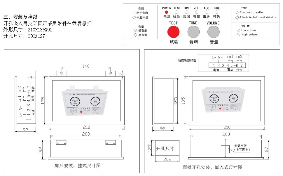 指示燈:6個LED指示,電源、試驗(yàn)、音調(diào)、音量、事故、預(yù)告